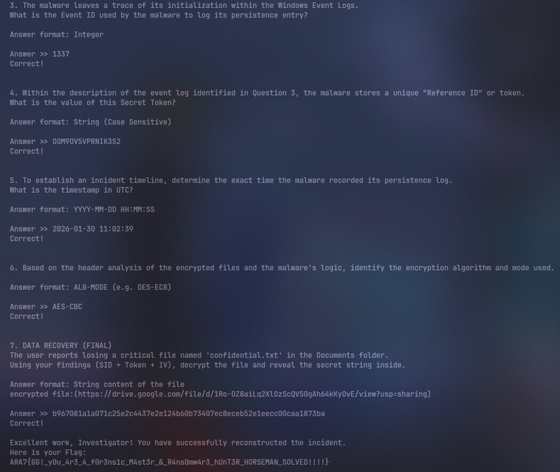 Answer: ARA7{GG!_y0u_4r3_4_f0r3ns1c_M4st3r_&_R4ns0mw4r3_hUnT3R_HORSEMAN_SOLVED!!!!}
