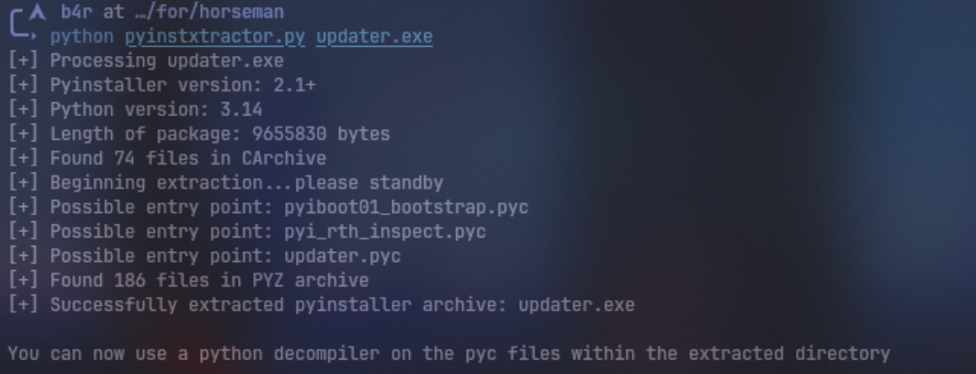 Sebelumnya karna gw udah dump malicious .exe nya, kita bisa cek bahwa binary tersebut ternyata adalah pyinstaller, langsung gw extract
