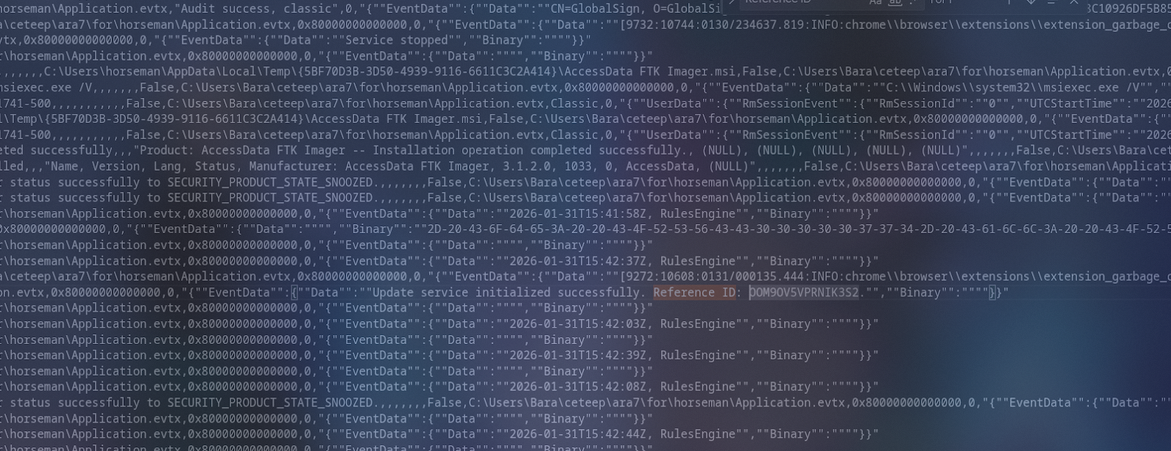 Disini gw pake EvtxECmd untuk parsing Application.evtx yang berada di path C:\Windows\System32\winevt\Logs\Application.evtx, setelah dapet langsung grep Reference ID ke Application.evtx