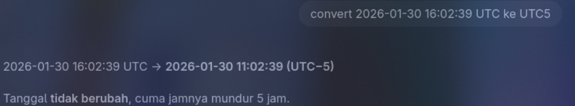 312,312,2026-01-30 16:02:39.0697403,1337,Info,Application,Application,0,0,horseman,16,,,,,,,,,,,,False,C:\Users\Bara\ceteep\ara7\for\horseman\Application.evtx,0x80000000000000,0,"{""EventData"":{""Data"":""Update service initialized successfully. Reference ID: OOM9OV5VPRNIK3S2."",""Binary"":""""}}kalo berdasarkan data di atas, seharusnya kan jawabannya 2026-01-30 16:02:39, tetapi saat gw submit salah, jadi gw coba untuk convert ke banyak nya zona waktu, dan salah satunya gw mencoba convert ke UTC 5