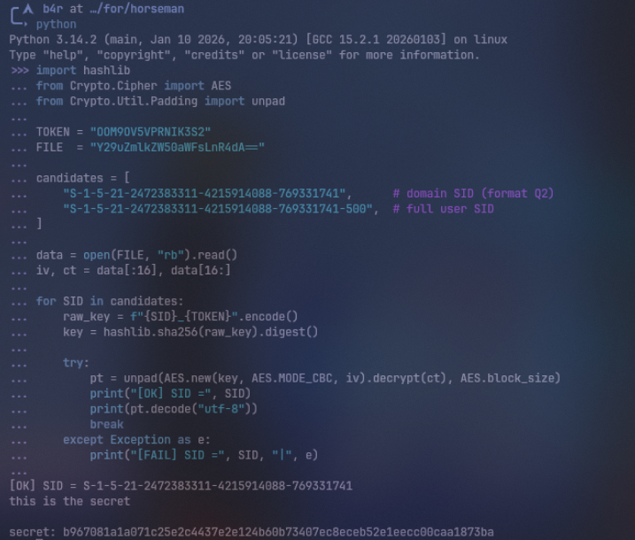 try: pt = unpad(AES.new(key, AES.MODE_CBC, iv).decrypt(ct), AES.block_size) print("[OK] SID =", SID) print(pt.decode("utf-8")) break except Exception as e: print("[FAIL] SID =", SID, "|", e)