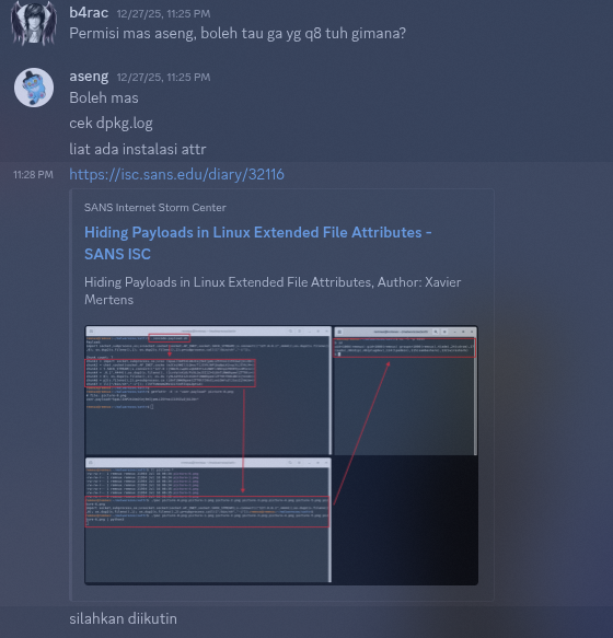 Jadi, pada saat Cyber Jawara Quals 2025 kemarin, lebih tepatnya pada tanggal 25 Desember 2025, gw ngerjain soal foren mas aseng yang berjudul Unorthodox Part 1 dan berujung upsolve (solve diluar jam lomba) karna gw stuck di pertanyaan terakhir… dan baru solve saat gw sendiri nanyain soal itu ke author nya (aseng) dan gw dpet insight baru dari chall ini.