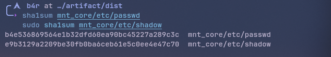 sudo losetup -P -f --show CoreStock.rawsudo pvscansudo vgscansudo vgchange -ay ubuntu-vgsudo mount /dev/ubuntu-vg/ubuntu-lv mnt_coreQ1: Provide the current state SHA1 checksum of /etc/passwd and /etc/shadow files respectively.