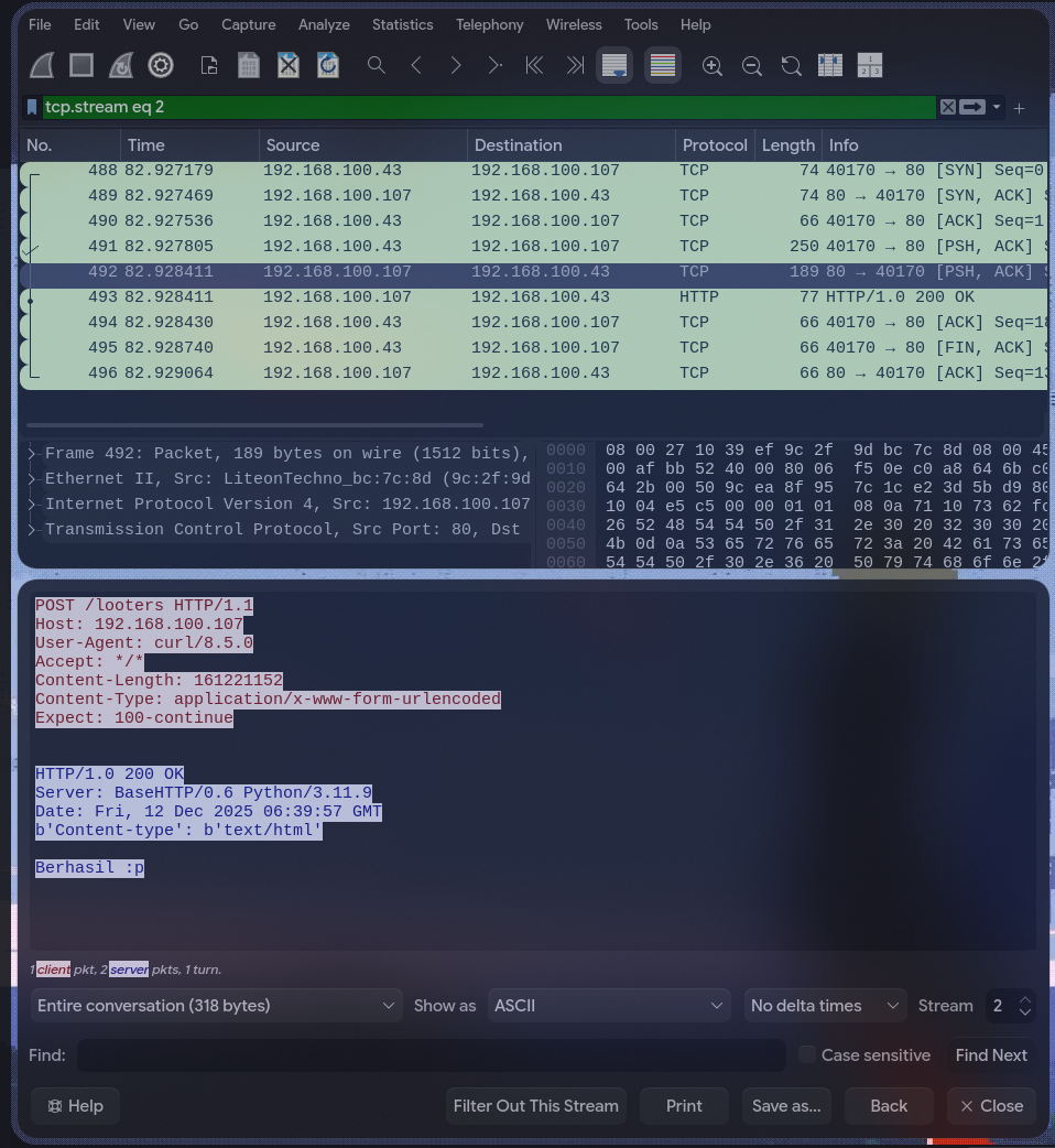 Disini masih pake PCAP nya, pake wireshark nya coba follow stream ke protocol TCP, dan nnti dibagian stream ke 2 akan ada request dan response http