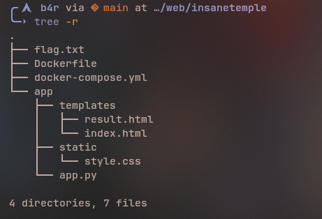 Disoal insanetemple ini, kita diberikan source code Flask backend. Mari kita bedah struktur file dan vulnerability-nya.