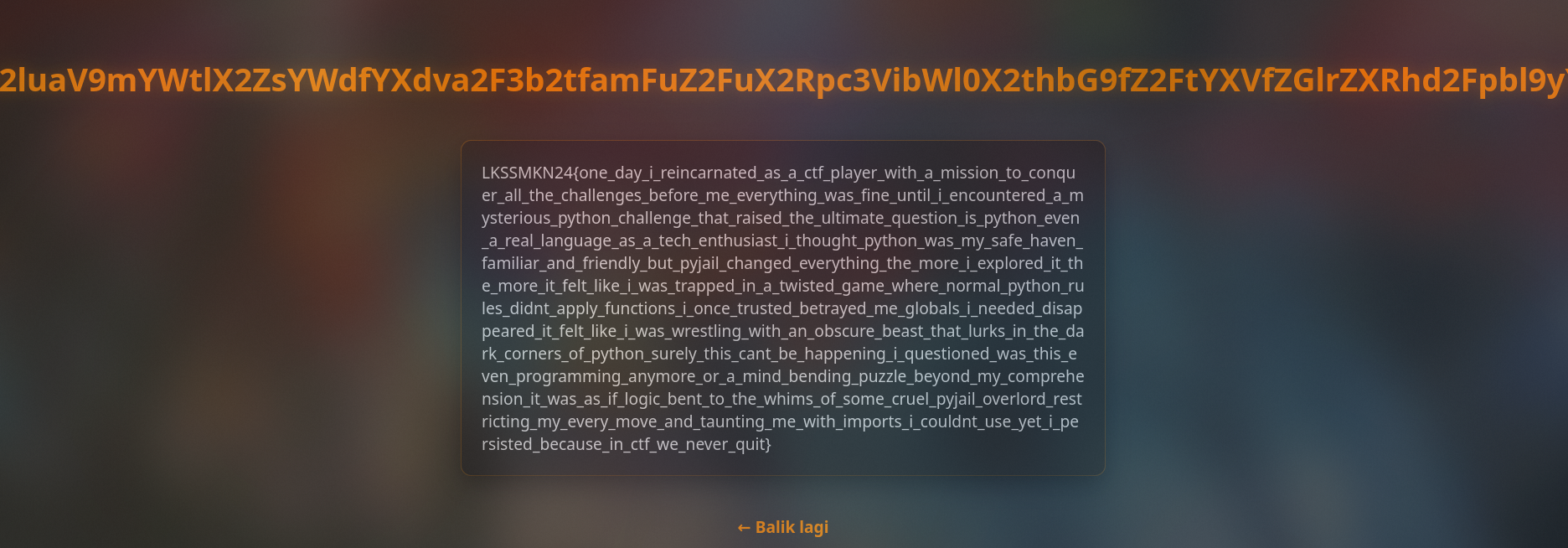 LKSSMKN24{one_day_i_reincarnated_as_a_ctf_player_with_a_mission_to_conquer_all_the_challenges_before_me_everything_was_fine_until_i_encountered_a_mysterious_python_challenge_that_raised_the_ultimate_question_is_python_even_a_real_language_as_a_tech_enthusiast_i_thought_python_was_my_safe_haven_familiar_and_friendly_but_pyjail_changed_everything_the_more_i_explored_it_the_more_it_felt_like_i_was_trapped_in_a_twisted_game_where_normal_python_rules_didnt_apply_functions_i_once_trusted_betrayed_me_globals_i_needed_disappeared_it_felt_like_i_was_wrestling_with_an_obscure_beast_that_lurks_in_the_dark_corners_of_python_surely_this_cant_be_happening_i_questioned_was_this_even_programming_anymore_or_a_mind_bending_puzzle_beyond_my_comprehension_it_was_as_if_logic_bent_to_the_whims_of_some_cruel_pyjail_overlord_restricting_my_every_move_and_taunting_me_with_imports_i_couldnt_use_yet_i_persisted_because_in_ctf_we_never_quit}
