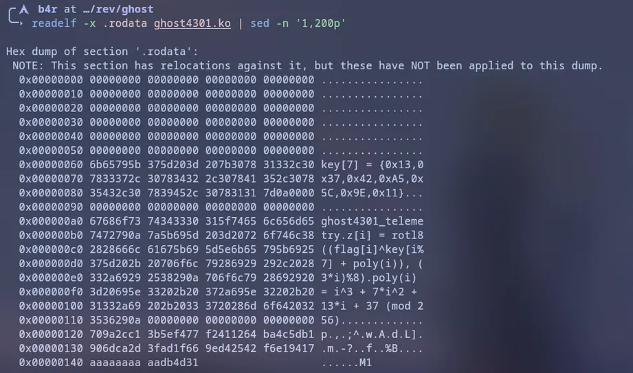 "ghost4301_telemetry\nz[i] = rotl8((flag[i]^key[i%7] + poly(i)), (3*i)%8)\npoly(i) = i^3 + "