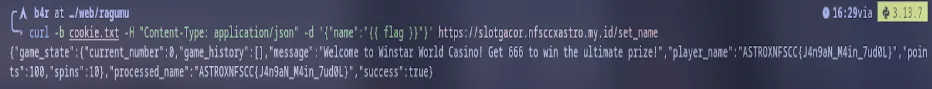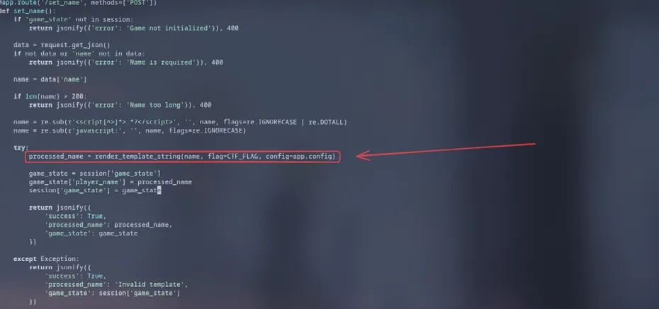 Disini server sudah menginisalisasi flag nya di dalam variabel flag, jadi disini cukup memangil dengan {{flag}}